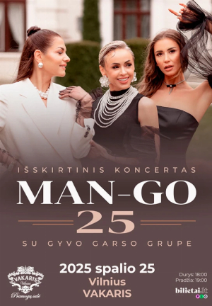 ![]() Išskirtinis MAN-GO koncertas su gyvo garso grupe Viena populiariausių visų laikų Lietuvos pop muzikos grupių „Man-go“ kviečia į vienintelį išskirtinį koncertą Vilniuje su gyvo garso grupe. Kaip teigia, „Man-go“ grupės narės Rima, Gabija ir Justina, koncerte gerbėjai išgirs žinomiausias grupės per 27 metus išleistas dainas bei specialiai atrinktus kūrinius. „Mūsų dainose dažnai didelis dėmesys skiriamas metų laikams. „Pavasariniai žiedai“, „Ilgesio Ruduo“, „Liūdnos Kalėdos“ – tai tik keletas iš daugelio mūsų kūrinių, kurie perteikia skirtingų metų laikų nuotaikas. Grupės „Man-go“ koncertas su gyvo garso grupe - 2025 m. spalio 25 d. (šeštadienis) 19:00 val. Vilniaus pramogų salėje „Vakaris“. ![]() |
