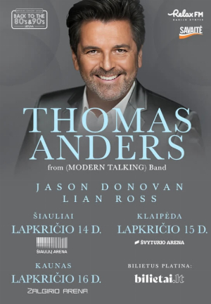 ![]() THOMAS ANDERS from MODERN TALKING | JASON DONOVAN | LIAN ROSS Trys miestai, trys arenos ir trys muzikiniai desertai viename. Lapkričio 14 d. – Šiaulių, 15 d. – Klaipėdos “Švyturio”, 16 d. – Kauno „Žalgirio“ arenoje pirmą kartą Lietuvoje koncertuos ne tik Europą sužavėjęs australas Jason Donovan, Vokietijos žvaigždė Lian Ross ir legendinis Thomas Anders iš vienos sėkmingiausių grupių pop muzikos istorijoje „Modern Talking“!